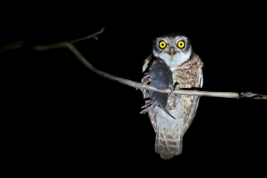 | It was absolutely dark outside our homestay at Bali island in Sunderban Tiger Reserve. Evening snacks were given. We were discussing the images we clicked throughout the day. Suddenly we heard the screeching of an owl nearby. Without wasting time me with my two friends and guide left our nest to find the source. After a rigorous searching, my guide shouted in excitement, pointing out to a branch of a tree. We were amazed. A spotted owlet was sitting there with a rodent in its claw. |